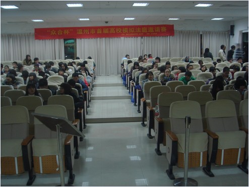 在本次模拟法庭大赛中,同学们做了全面的筹备工作。其中角色的扮演人员,包括法官一名,陪审员两名名,书记员一名,以及原方代理律师一名,被告方代理律师两名,另有原告,被告等等。正式开庭阶段,同学们很快进入了角色,各项活动都严格按照实际工作的要求来开展,模拟庭审过程显得十分逼真,塑造了一种严肃、正规的法庭气氛,使同学们真正地进入了"实战"的状态。法官代表着公平、公正,指引着模拟法庭活动的顺利进行,其沉稳的作风更是充分展示了法官驾驭法庭的能力;原告方代理律师慷慨激昂、有理有据,针对案件的事实和所依据的法律进行了有效的控诉;被告方代理律师则以维护其委托人的合法权益为出发点,以事实为根据,抓住案件的疑点和漏洞进行穷追猛打,有张有弛地与控方律师进行着唇枪舌战。到了庭审最后,被告被要求停止对原告的侵害,原告其他请求被驳回,公平与正义在此得到了伸张。庭审结束后,瓯海法院副院长叶建平老师对庭审活动进行了点评,充分肯定了本次活动所取得的成果,并就如何进一步完善此类活动提出了宝贵的意见。