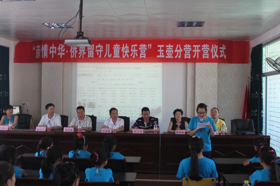 2013年7月8日上午9:30,温州市侨界留守儿童快乐营玉壶分营开营仪式于玉壶镇中心小学多媒体教室隆重举行。出席本次开营仪式的领导有:温州市侨联秘书长林春雷,温州市侨联维权部部长苏彩亮,文成县侨联副主席胡翠娥,文成县外联办主任胡立帅,玉壶镇小校长周锋等;"亲情中华"温州市侨界留守儿童快乐营玉壶分营实践队全体队员,玉壶镇小百余名营员参加开营仪式;玉壶镇小大队辅导员刘丽华主持开营仪式。