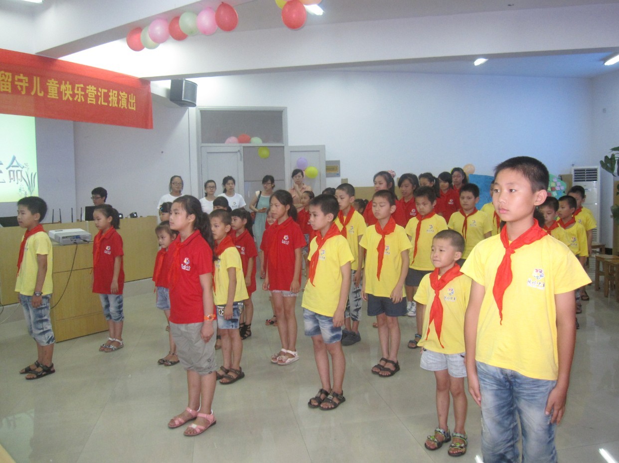 出席本次成果汇演的嘉宾有县政协党组副书记、副主席、县委统战部部长周星柱,县委统战部常务副部长王澄荣,乌牛街道党工委书记金翎翼,乌牛街道办事处主任李月道,县教育局副局长陈伟峰,县侨联副主席王萍萍,乌牛街道党工委委员余钢梁,还有乌牛镇第一小学的校长金芝林。下午2点30,汇演正式开始。首先是领导的致辞,金芝林校长、王萍萍副主席、陈伟峰副局长等多位领导对孩子们致以诚挚的关怀和深切的问候,并向志愿者予以真诚的感谢,然后,由温州市侨界留守儿童快乐营第三季乌牛分营队长王燕萍宣布汇演正式开始。首先是庄严神圣的出旗仪式,伴随着激昂的音乐,旗帜缓缓入场,伴奏随之响起,唱队歌:我们是共产主义接班人...",如此响亮的歌声,真是让人心潮澎湃。接下来,是由乌牛的快乐小天使们全体表演的手语舞"怒放的生命",动作稚嫩而富有生气,让嘉宾和家长忍俊不禁。紧接着是PPT的放映,细致地展现了这17天志愿者与留守儿童生活的点点滴滴,将快乐一同分享。另一边,时装秀已准备完毕,踏着时尚的步伐,席卷而来,渲染开一片火红。秀完,是优秀志愿者和优秀营员的颁奖环节,由各领导亲自颁发证书,授予奖品。幕起幕落,到了话剧"熊娃娃的春天"。此剧充分表达了孩子们对快乐营的生活的无限留恋和无限期待。最后,是"弟子规"表演,以朗诵、歌唱和舞蹈的形式一齐演绎,诠释了做人的基本道理。