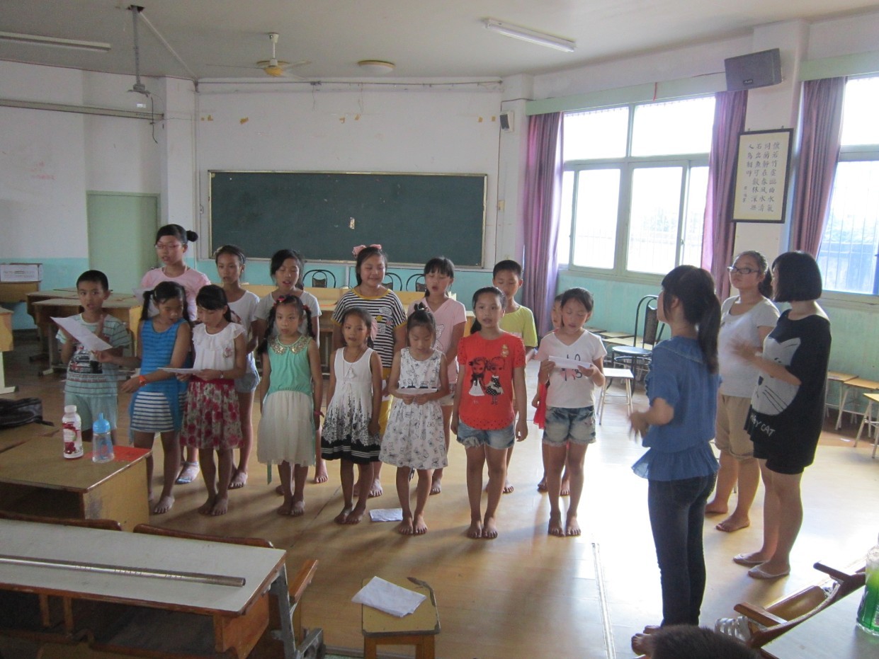 一大清早,孩子们便陆陆续续来到学校,他们有的在走廊上下象棋,有的在编手绳,有的在跳皮筋...这样的单纯而简单的游戏,却能让他们心满意足。八点整,志愿者开始按照既定的时间表正式排演。首先是弟子规的舞蹈动作,几个跳舞的女孩子都学得很用心,身段柔软,心思玲珑,真是一点即透。接下来是音乐的教唱,包括"中国少年先锋队队歌"等歌曲。孩子们清脆的童声从教室传出,带着对未来的憧憬,对自己的激励,感染了所有辛苦劳动的志愿者。然后,便是校园舞台剧"布娃娃的春天"的演练,这是一个关于留守儿童的故事,讲述了孩子们在志愿者的帮助下也在这样一个盛夏终于找到了属于他们自己的春天。