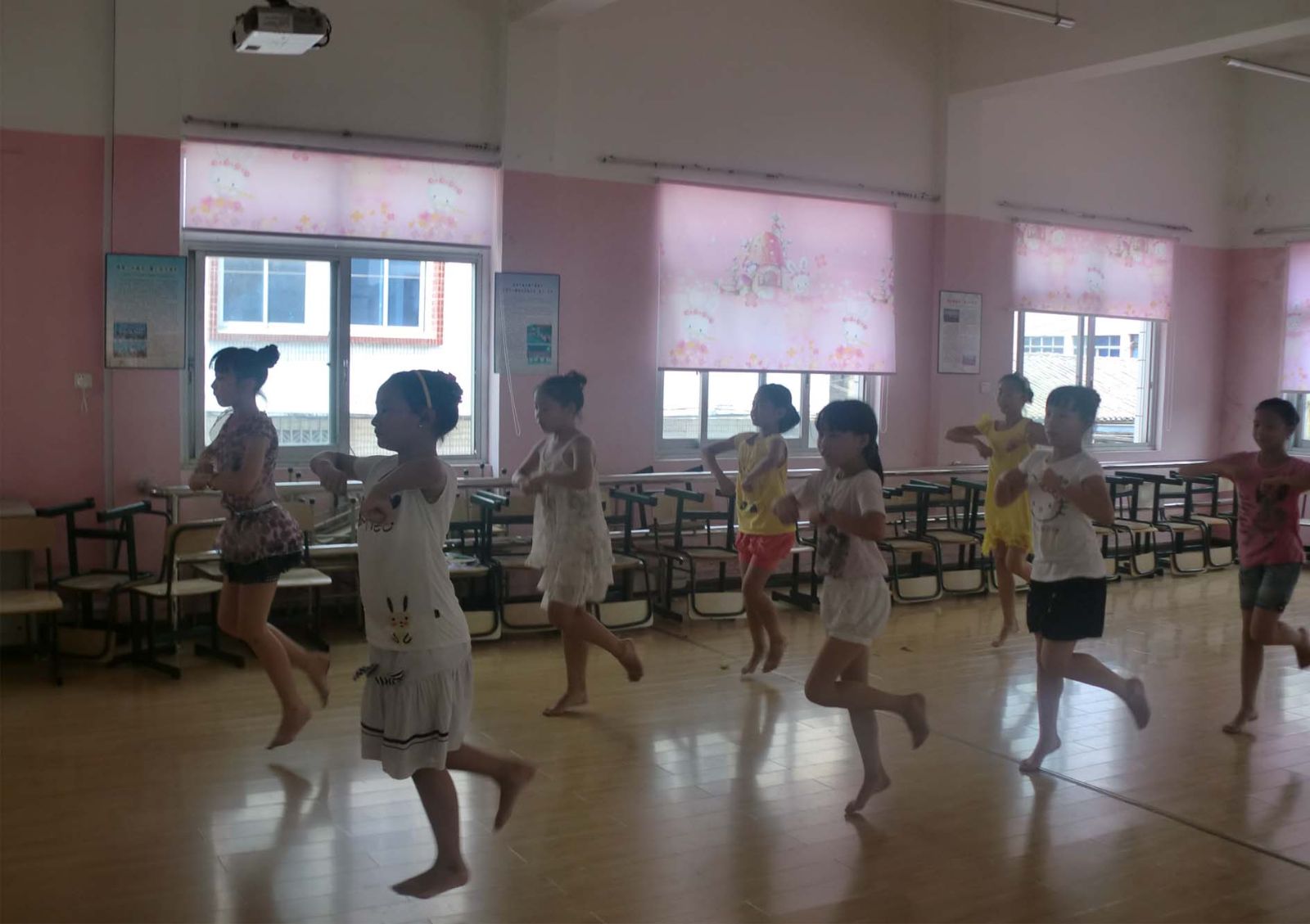 在经过全部队员的讨论,我们得出了汇演的节目。在丽岙一小的音乐老师胡接惠的协助下,挑选出了表演节目的孩子们。每天我们都会安排出时间给孩子们编排节目,在别的孩子都已经放学了的时候她们仍然留在音乐教师学习着动作。在队员的指导中,她们认真地做着,做错了就改正,一直坚持着。天气十分炎热,一个个都跳得大汗淋漓,但是不管是她们还是我们的队员都没有说辛苦,脸上还露出甜美的笑容。