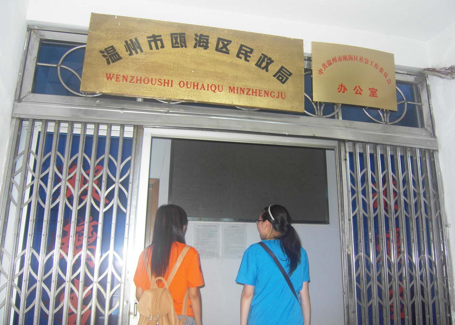 中午12点30分,商标注册主体资格申请小队的三位成员从C区出发前往瓯海区民政局。由于百度乘坐公车的信息错误和民政局较偏僻等原因,三位成员在烈日下摸索了近两个小时终于找到了瓯海区民政局。进入民政局,三位成员和民政局办公室的一位工作人员进行了简单的交流,初步了解了有关社团登记的事项。交谈中她建议前往瓯海区审批中心进行进一步的了解,于是我们又赶到了瓯海区政府,找到了瓯海区审批服务中心。由于政府部门内部人员的调配,管理登记的工作人员还未落实,于是我们向其他工作人员简单了解了一下社团登记准备资料参考的网站,询问了管理人员工作登记处的电话号码。走之前,审批中心的工作人员还很友好的送了几张登记流程的五色纸张。