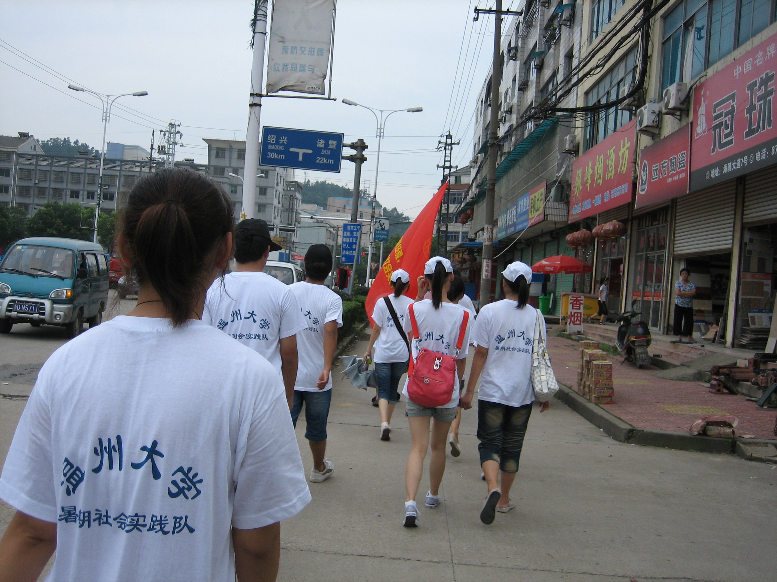 2010年7月11日,我们"追溯‘枫桥经验’,亲近和谐枫桥"暑期社会实践队成员,在鲜艳的旗帜——"追溯‘枫桥经验’,亲近和谐枫桥"带领下,迈步向学勉"进军"。这引起了路上行人的关注,哈哈,看来我们的效果得到初步展现咯!瞧,他在看温州大学的标志;听,他们在讨论枫桥经验,嘿嘿!