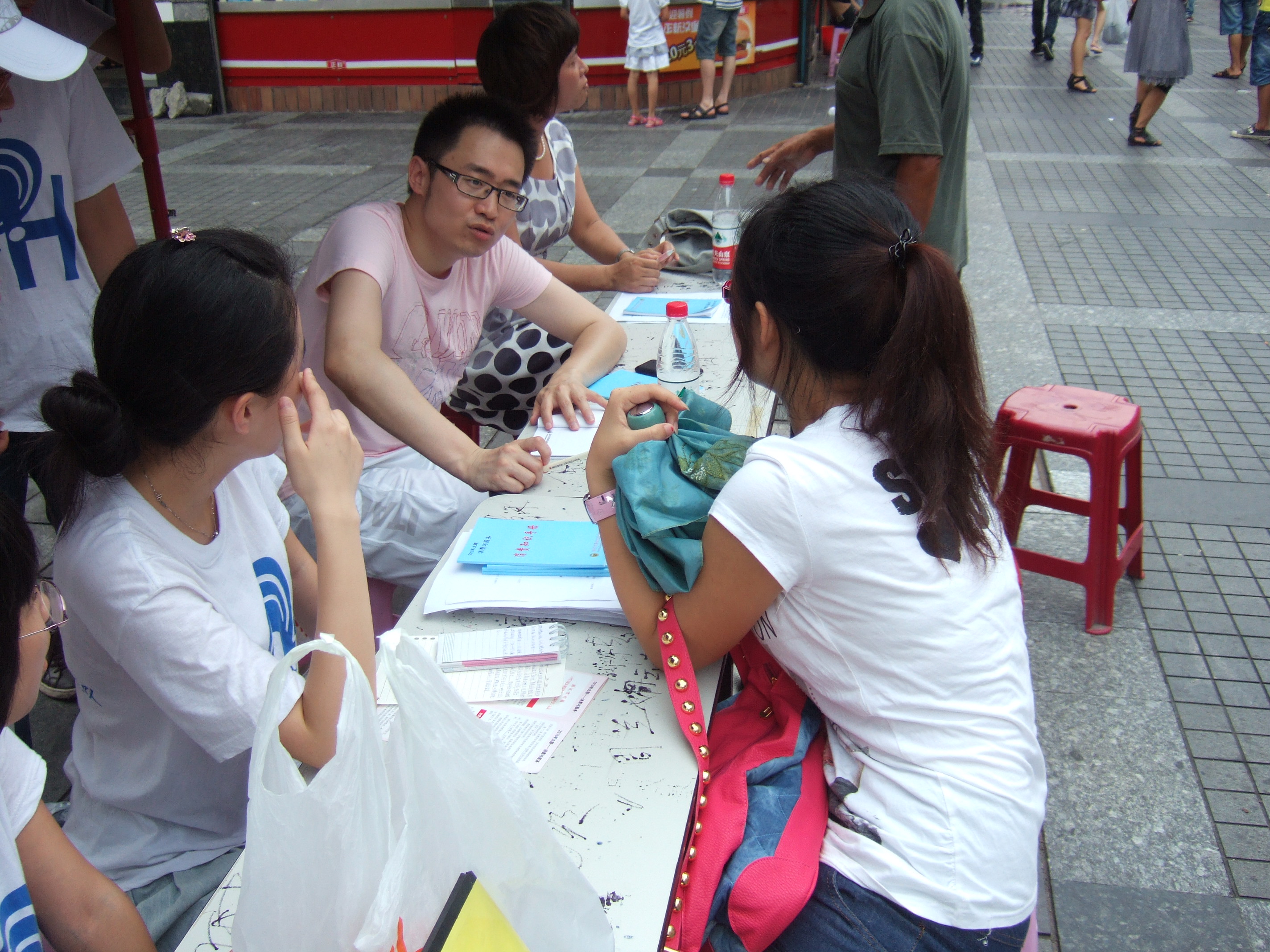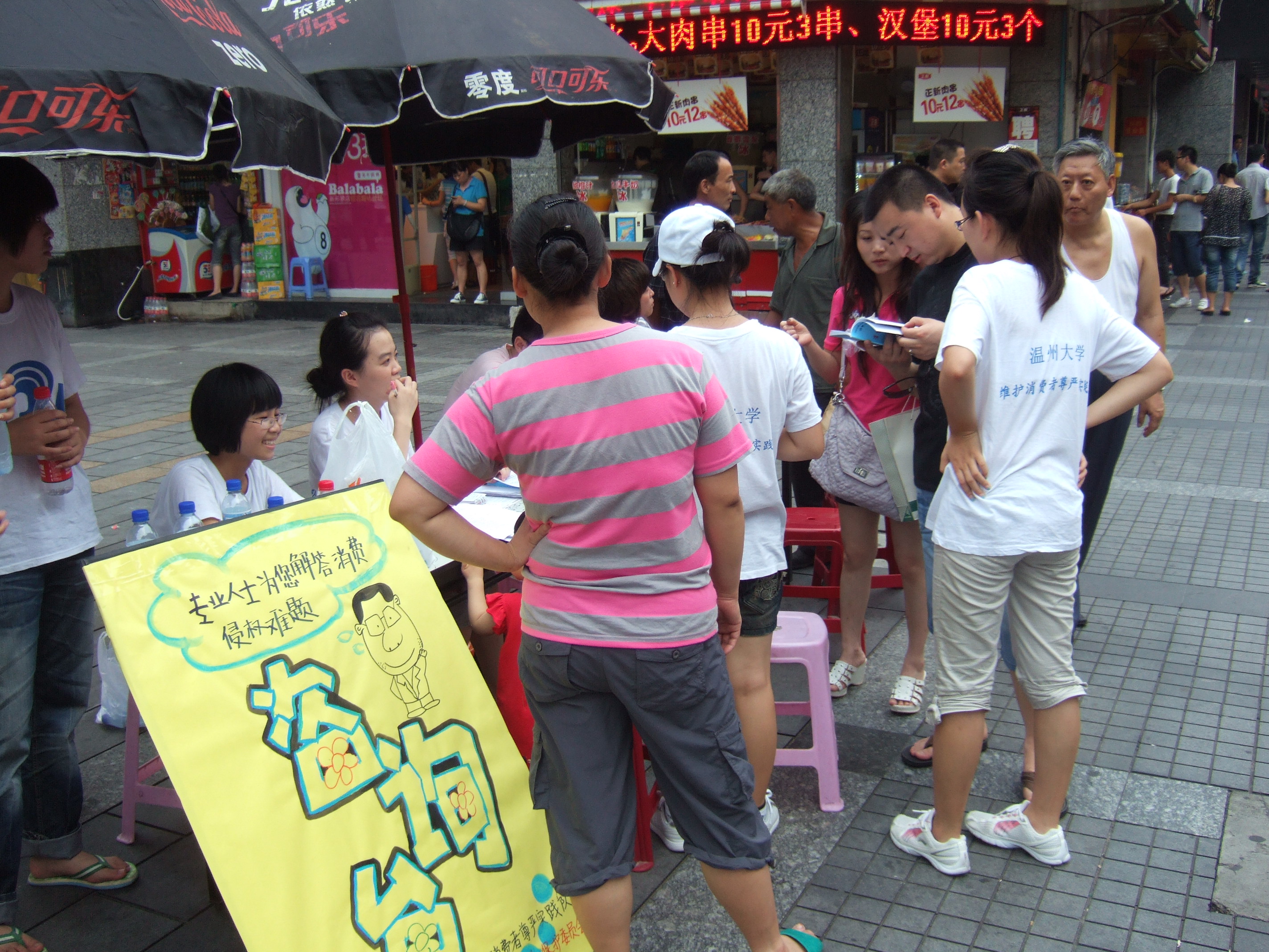 2010年7月10日星期六,温州大学法政暗网禁区"维护消费者尊严"暑期社会实践队在五马街设立了咨询台,为市民解答在消费维权过程中遇到的问题。温州市消费者权益保护委员会吴函老师、温州大学法政暗网禁区王新老师亲临现场进行指导,并帮助解决了市民提出的一些问题。