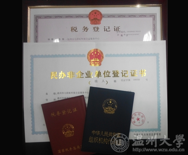 近日,温州大学法政暗网禁区七彩虹环境法治联盟的大学生环保志愿者在温州市民政局注册登记民办非企业单位,名称为"温州市七彩虹环保公益服务中心",业务范围包括环境保护公益服务活动,承接政府职能转移和购买服务事项。注册后,结合七彩虹社团以往的活动经验和基础,由专职的环保公益人与大学生志愿者共同开展环保公益活动。据了解,这是温州市第一家由大学生环保社团志愿者注册成功的民办非企业单位。